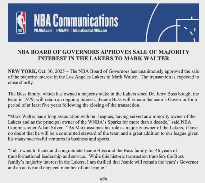 NBA官宣,理事会一致同意批准马克-沃尔特收购湖人。
